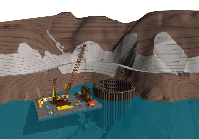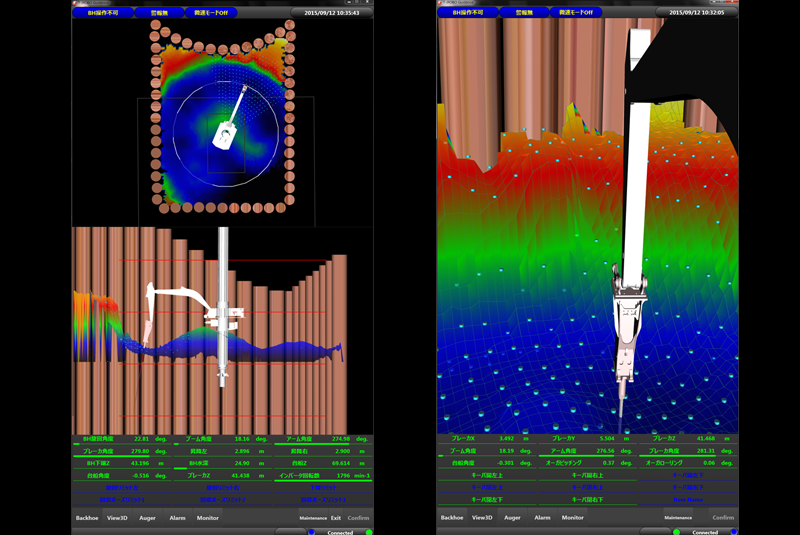 ●気中シャフト上座標計測による確実な水中位置計測、マシンガイダンスが搭載された遠隔操作の水中掘削機