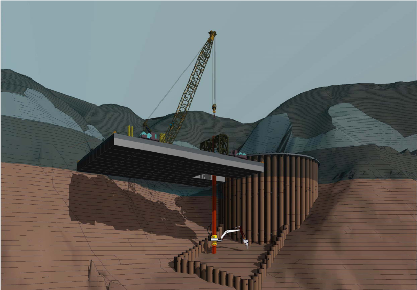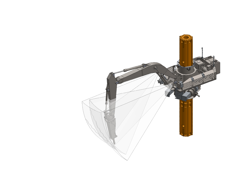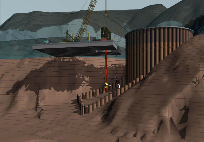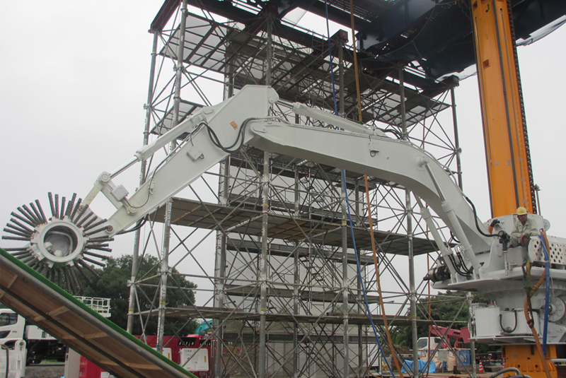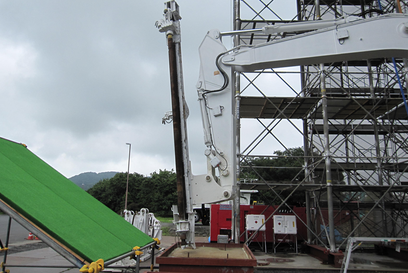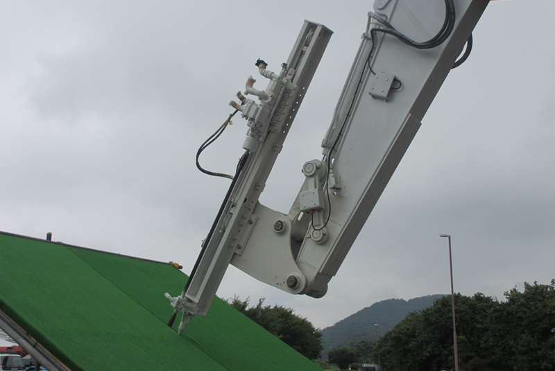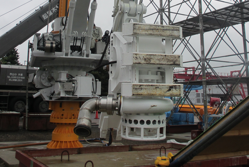 ●急斜面へのシャフトの固定ができるため、機械の滑落が無く、確実に機械反力が採れる水中掘削機