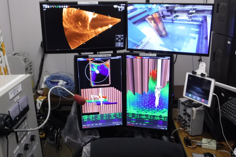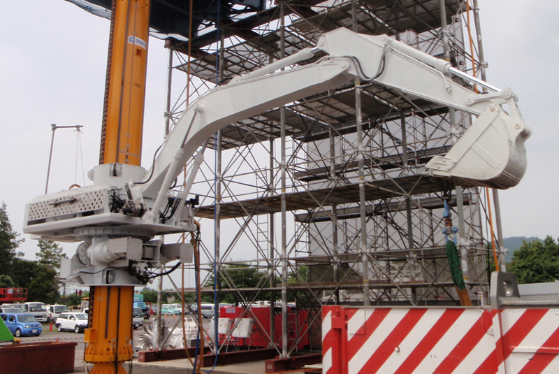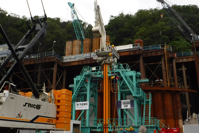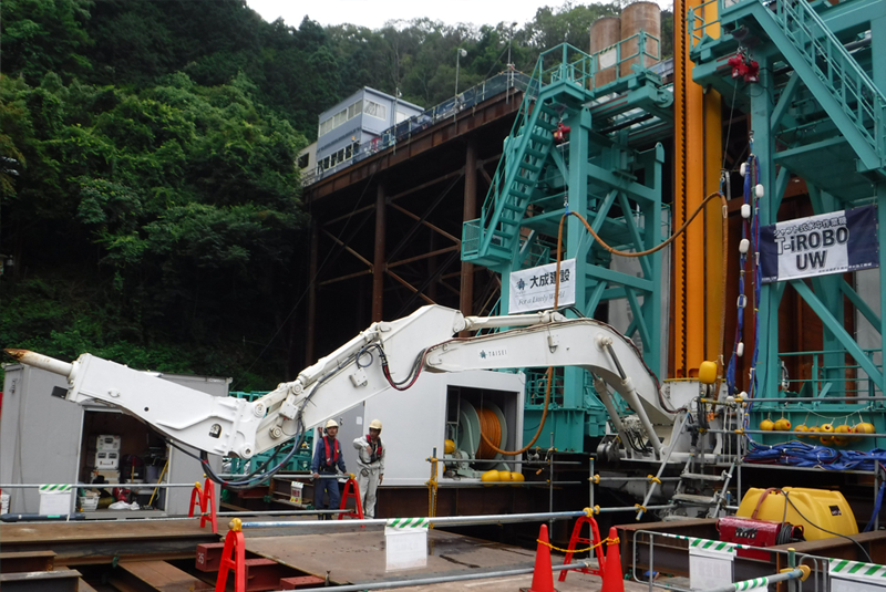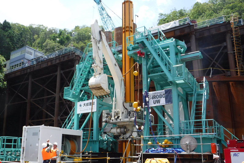 水中の各種作業を、ダイバーを使わずに施工するために開発された機械で、ダム湖のように深くて、急峻で、視界の悪い場所での施工に威力を発揮します。可視化技術と情報化施工により遠隔で操作を行うため安全性と施工性が大幅に向上しました。