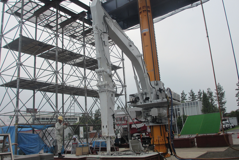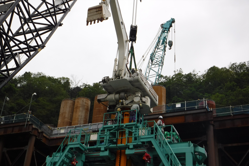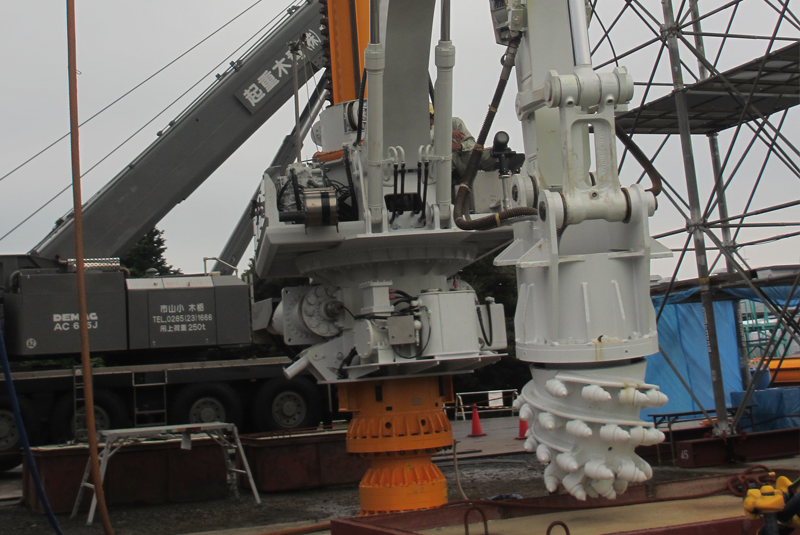 シャフト式水中作業機は、水上の台船から地盤にシャフトを降ろし、そのシャフトを昇降する作業機に様々なアタッチメントを取り付けて砕岩、掘削、ズリ処理、精密測深、撮影などの一連の水中作業を遠隔操作で安全かつ確実に行える機械です。