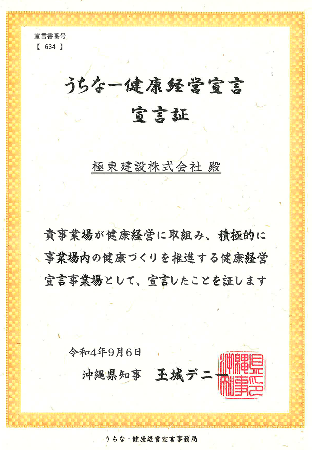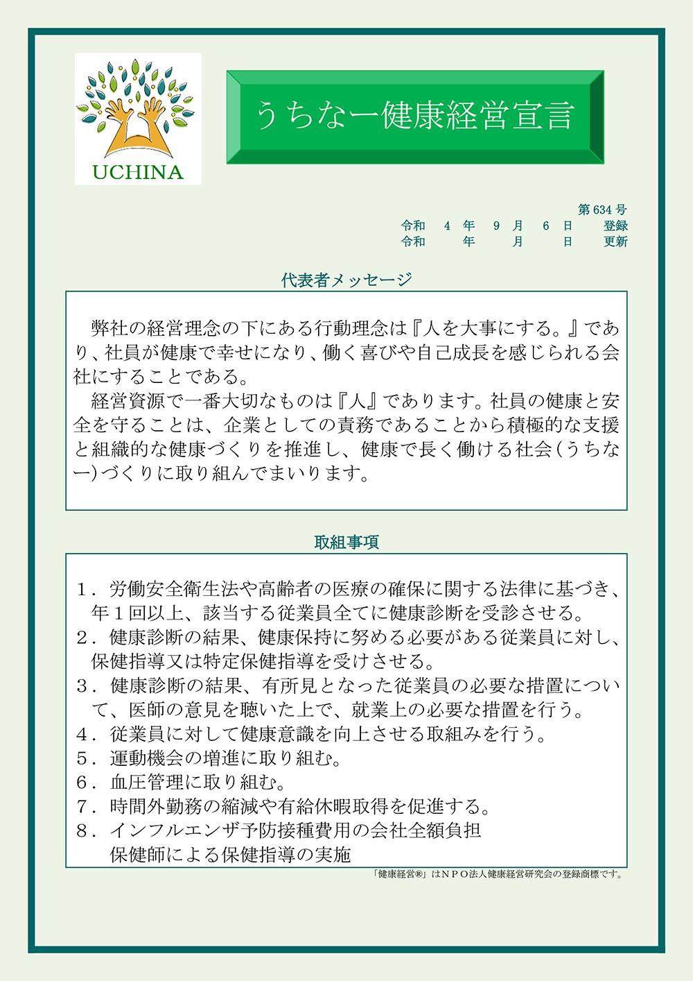 「うちなー健康経営宣言」では、経営トップ自らが健康経営に取り組むメッセージを表明して、事業場の取組事項を「見える化」します。