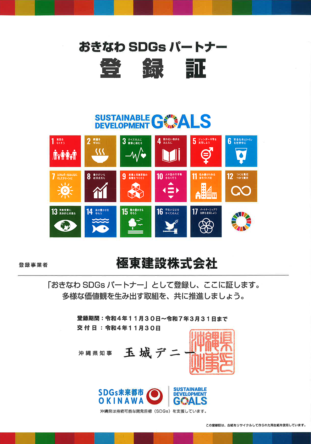 当社は、SDGsの達成に向けた取り組みを行うとともに、県民に向けたSDGsの普及活動を行う企業・団体として沖縄県より「おきなわSDGsパートナー」として登録されました。