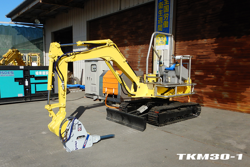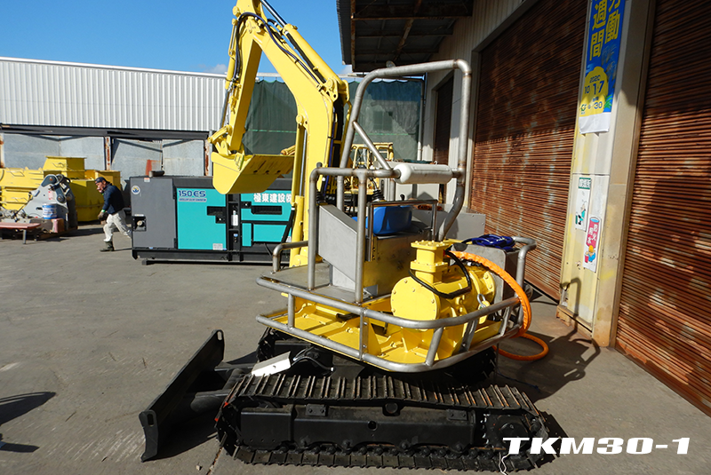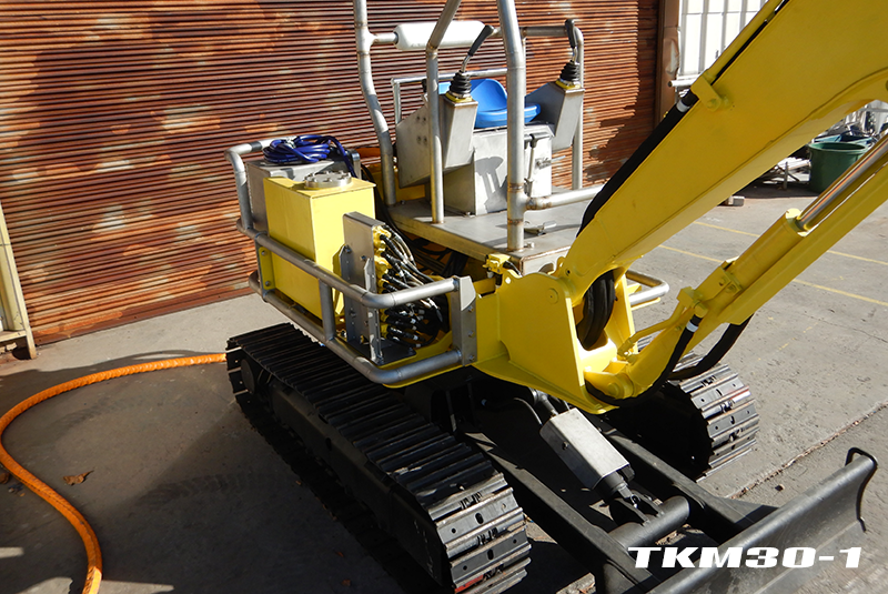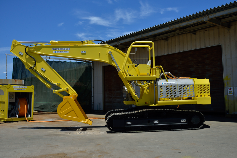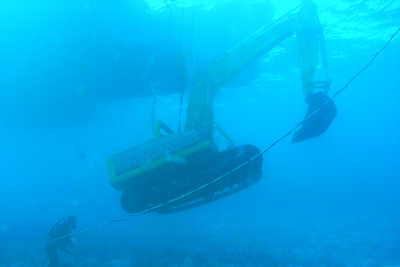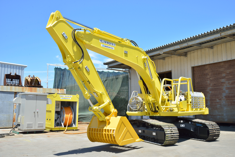 陸上機と水中バックホウとの一番の大きな違いは、ディーゼルエンジンの代わりに水中モーター(AC440V)で動力源となる油圧ポンプを動かし、水中で動く事を可能にした事です。(その他の機械構造も水中で使用できる耐圧構造等に改造しています。)