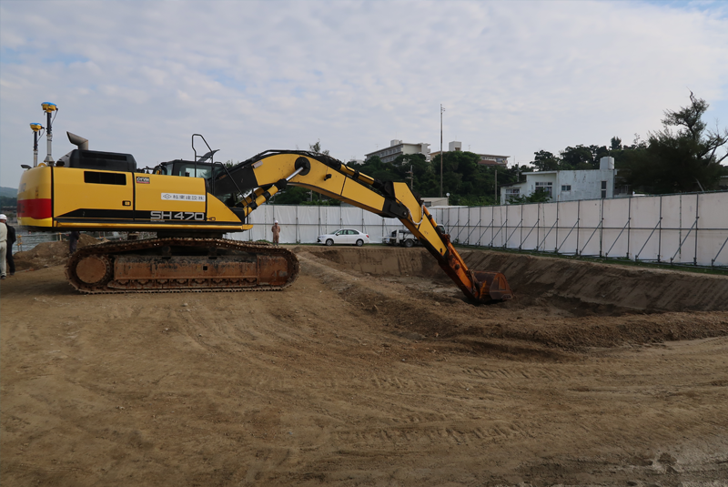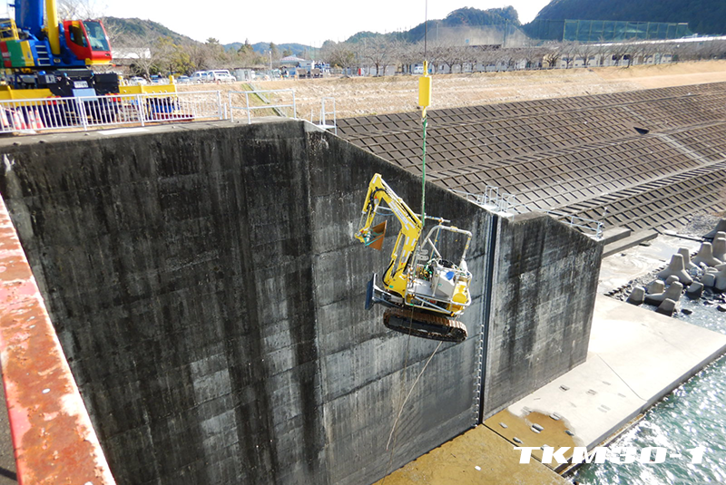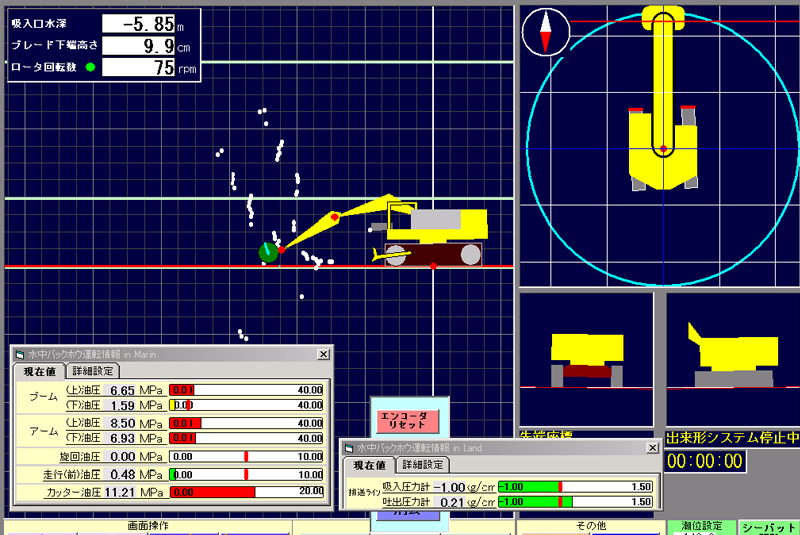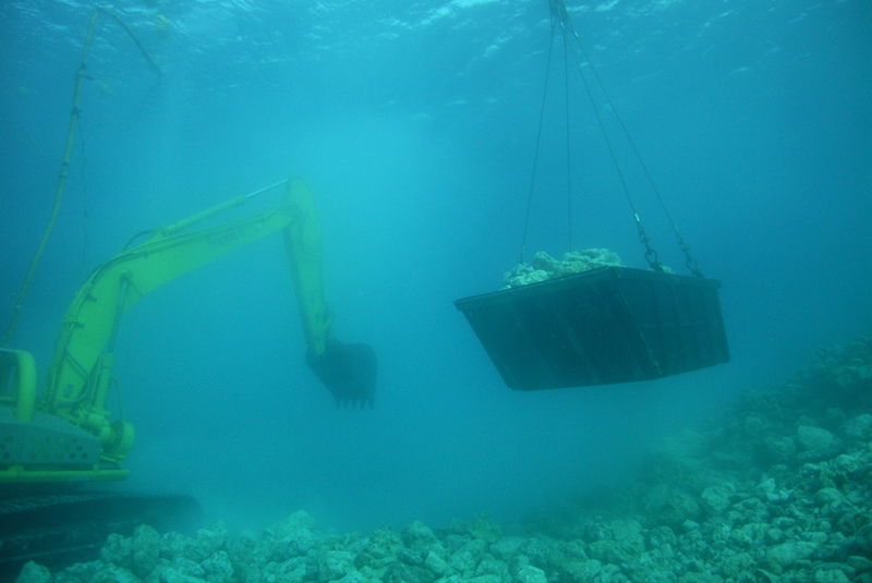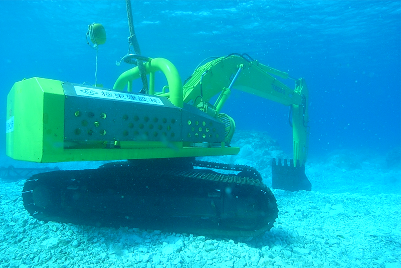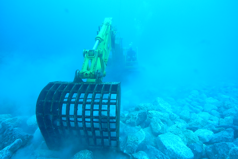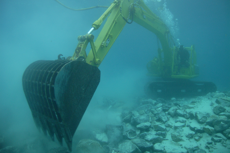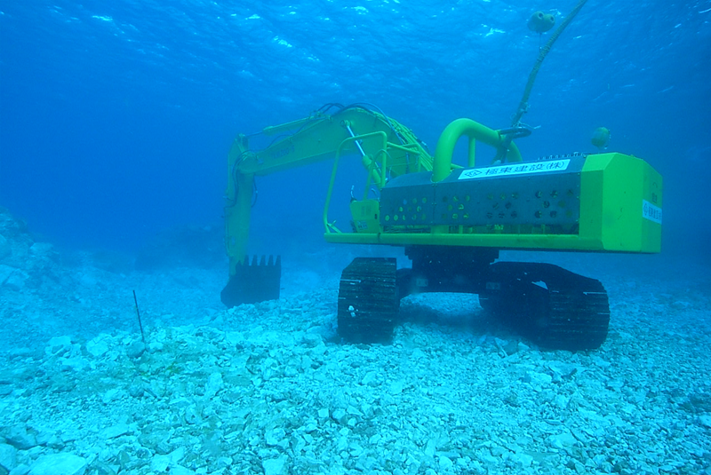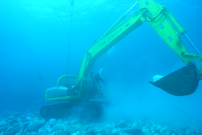 現在、水中バックホウの機械耐水深は、-50mまで施工可能で、ダイバーの目視確認により陸上バックホウと同等の精度で施工を行う事が出来ます。
