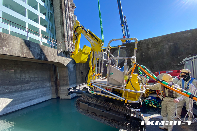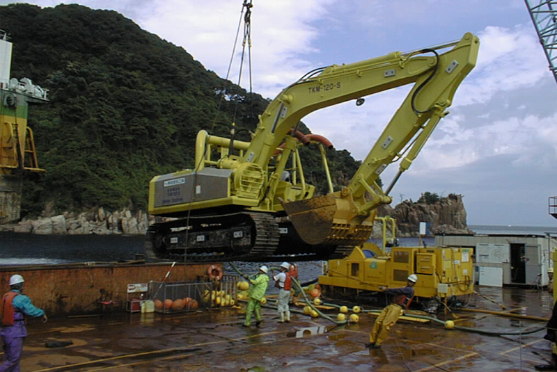 水中バックホウの操縦はダイバーが直接水中で行い、電源の「入・切」やケーブルの繰り出し巻取りなどは船上(陸上)に配置した支援員が行います。