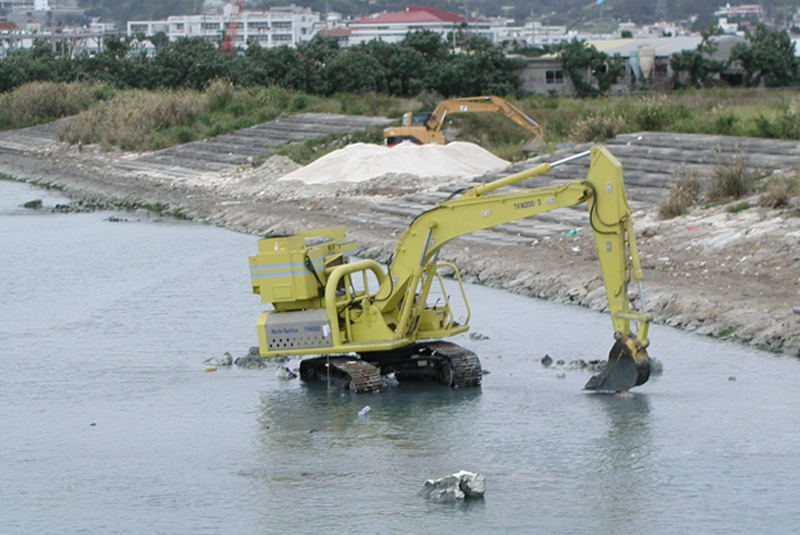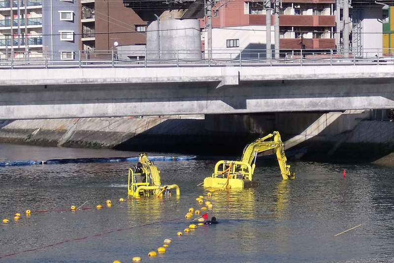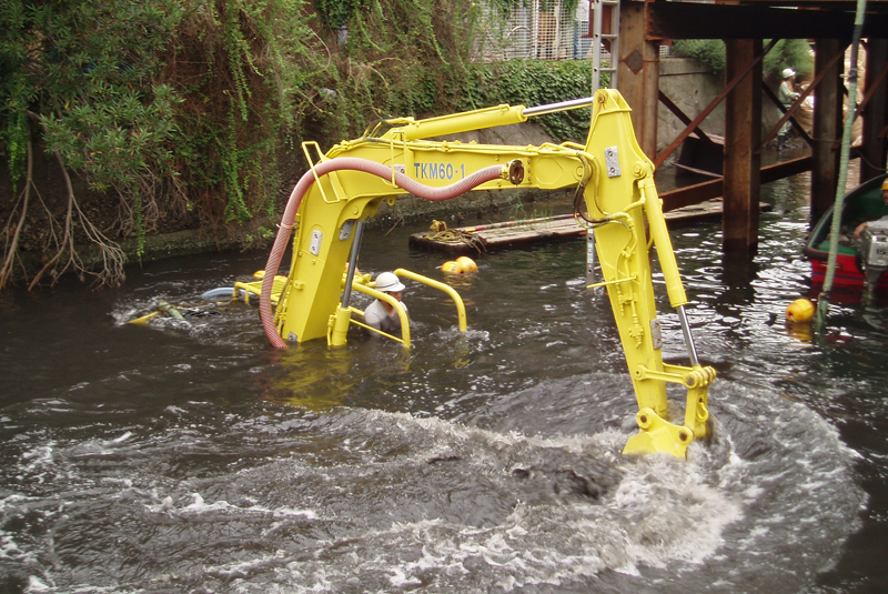 水中バックホウとは陸上の多くの整地・掘削作業に用いるバックホウをベースマシンとして、水中環境で稼動出来るように改造した機械です。水中バックホウは様々な所で紹介されていますが、当社は自社で開発、改造から、施工までを一貫して行っております。それに併せて多数の水中用アタッチメントも開発し、様々な作業に対応できる体制を整えています。